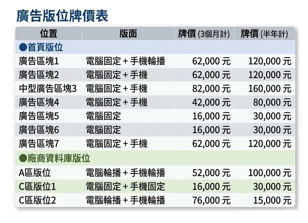 888營建互聯網 - 刊登廣告 欲了解詳情請洽線上LINE客服:@jdx8494u 搶先登記購買,早買早卡位喔!! 廣告版位 廣告牌價 廣告版位 廣告牌價 廣告版位 入口網站 廣告版位 找廠商頁面 廣告版位 廣告牌價 888營建互聯網保留最終修改與變更權利 詳細廣告版位依最新公告為準 附註: 1.如需拍照攝影及美編等服務,費用另行報價。 2.以上報價服務範圍:888營建互聯網內刊登上架及更換廣告畫面服務。 廣告刊登申請單 如欲刊登廣告,請填寫以下資訊,我們將盡快與您聯繫 苦胖券的回饋表單 連絡人(*) Invalid Input 電話(*) Invalid Input Email(*) Invalid Input 優惠代碼 Invalid Input 備註 Invalid Input 確認送出 .dt0e8rtn3fh{padding:15px;} .dt0e8rtn3fh,.dt0e8rtn3fh *{ max-width:100%; }