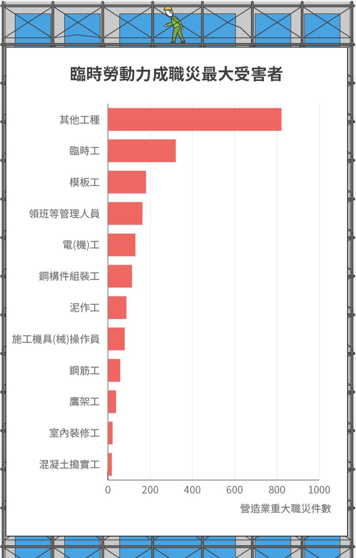 營造業重大職災案件中,以「其他工種」及「臨時工」為最大宗。臨時工指的是日領1,100元的點工,其他工種則是清潔及無法歸納者,都是工地較為臨時的勞動力。