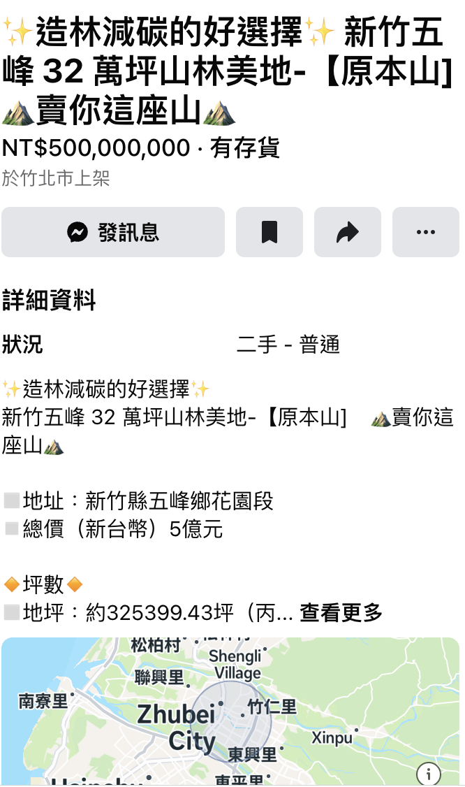 近期有房仲在臉書貼出山林地物件,位在新竹五峰鄉32萬坪林地,包含有丙種建地、林業用地、農牧用地以及交通用地,使用分區為山坡地保育地,直接賣出「一座山」,開價高達5億元。
